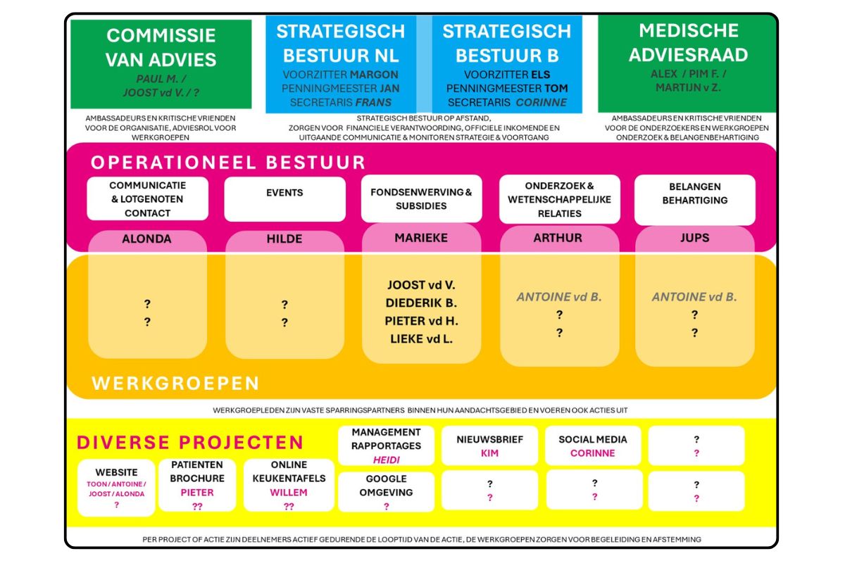 De klok op onze website telt af naar 20 juni 2027. Dat komt snel dichterbij, en er is nog veel te doen voor een toekomst zonder DFNA9. Daarom hebben we gekeken naar hoe we als stichting/vzw werken. We merkten namelijk dat er te veel werk bij te weinig mensen ligt.
